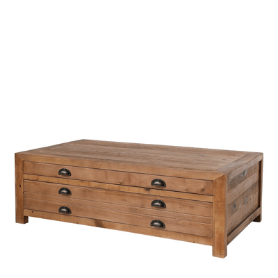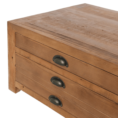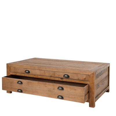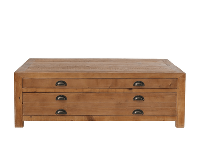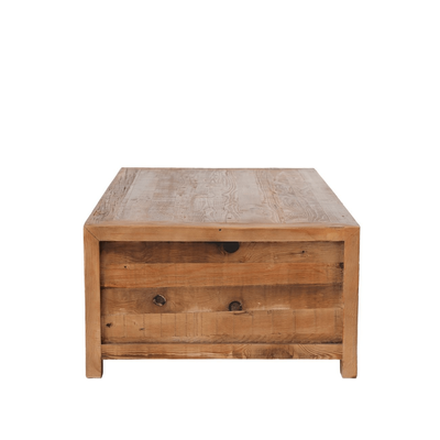 This coffee table is made from reclaimed pine, so each is unique to their own. The 4 drawers (2 either side) offer the capacity for reasonable storage.