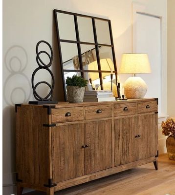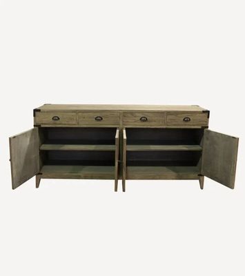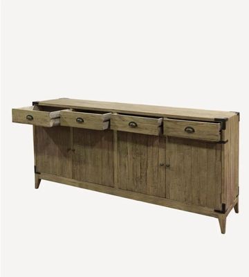 Functional sideboard featuring 4 drawers and 4 cupboards with 2 shelves. Made from reclaimed oak with metal handles and detailing. A great addition to the living room, kitchen or hallway.