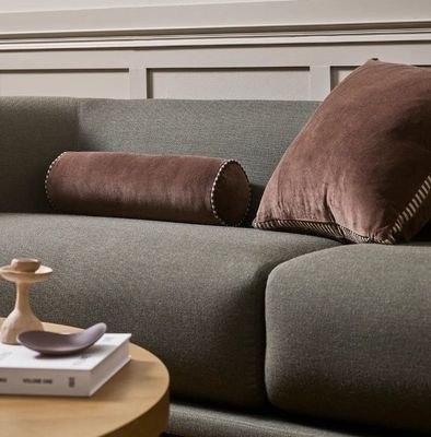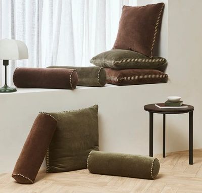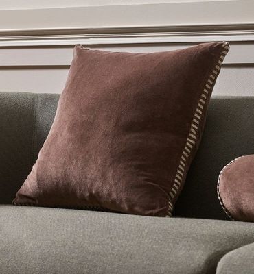 Plush cotton velvet meets considered structure in this chocolate-toned, box-style cushion. Framed with striped linen gussets, the Edward is a study in contrasts, balancing soft texture with architectural form. The result is a refined interplay of materials that is both luxurious and effortlessly liveable. Style with the Elliot-Chocolate bolster to introduce contrast in both shape and scale. Add a luxury finish with the Mosman throw in Sand.