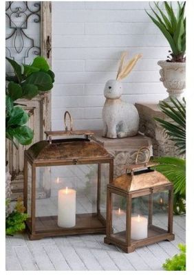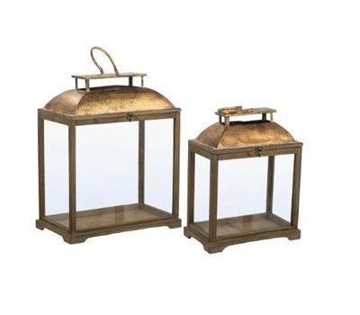THE ANTIQUE GOLD LANTERNS FEATURE A SET OF TWO ELEGANT LANTERNS WITH A DISTRESSED GOLD FINISH, ADDING A VINTAGE CHARM TO ANY SPACE. PERFECT FOR CREATING A WARM, AMBIENT GLOW WITH CANDLES.