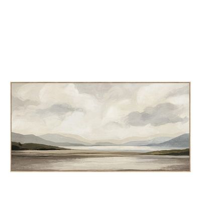 A hand embellished painting of a serene landscape with calm water, mountains, and soft clouds in muted tones - a perfect finishing touch for any interior space.