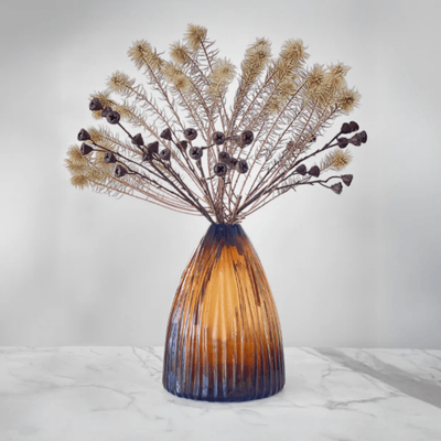 Beautifully textured large amber vase, perfect as a piece on its own on a coffee or dining table or single stem vase on a side table. 30cm high x 23cm wide. Made from glass.