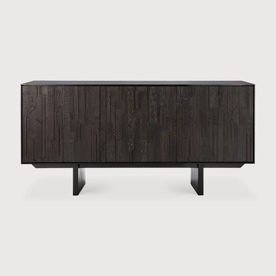 The layered wood pieces of the Ethnicraft Mosaic sideboard form a rhythm of shapes, originally inspired by the remaining offcuts from factory designs.