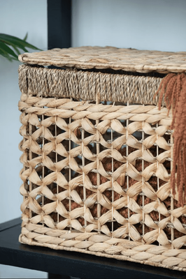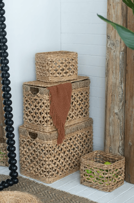 EARTHY AND FUNCTIONAL, THIS SET OF FOUR WATER HYACINTH BASKETS BRINGS NATURAL TEXTURE AND WARMTH TO YOUR HOME. PERFECT FOR STYLING ON SHELVES OR FOR STORING BLANKETS, TOYS, OR EVERYDAY ESSENTIALS, THESE BASKETS OFFER A BEAUTIFUL BLEND OF PRACTICALITY AND HANDWOVEN CHARM.