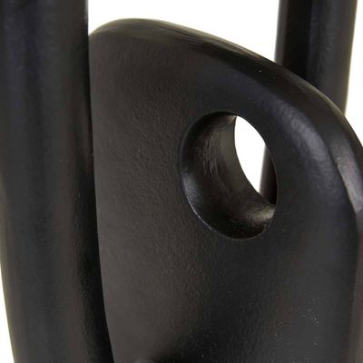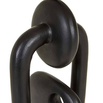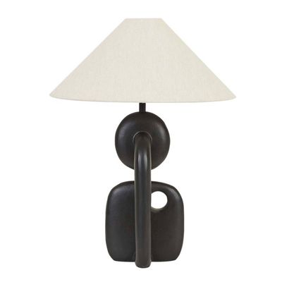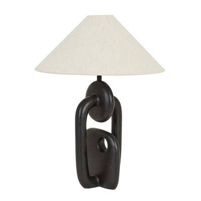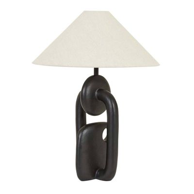 The Emery Link Table Lamp introduces a sculptural essence to lighting with its black ceramic base and tapered shade. This lamp is a timeless statement piece, blending functionality with artistic design. Its unique form offers a sophisticated touch to any room, providing ambient lighting with a sculptural twist.