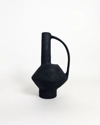 With its sculptural silhouette and sweeping handle, this black vase makes a dramatic statement — style it solo or pair with dried stems for effortless impact. Handmade in India from aluminum with a textured black finish, this handled vase combines bold geometry with timeless craftsmanship.