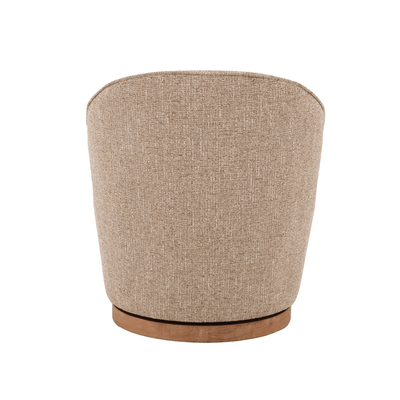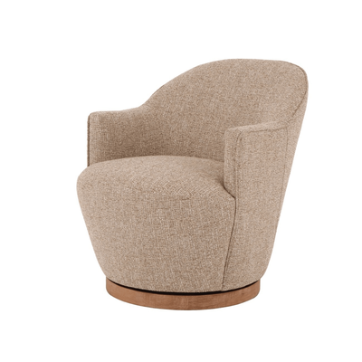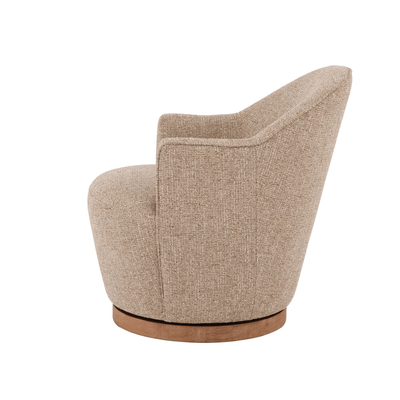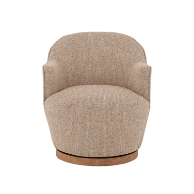 Perfectly proportioned with slim lines the Lockie chair belies it's stature with generous seating. Upholstered in textured boucle and set on a light oak swivel base. Its curved silhouette and tactile finish make it a versatile accent piece.