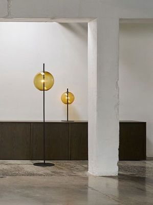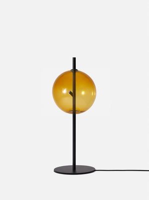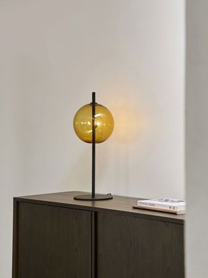 The matte steel column is thoughtfully designed with a convenient on/off switch and dimmer at the top of the stem. The unique lamp makes a statement with its spherical hand-blown glass shade, minimalist design, and gentle ambient glow. The LED light source provides three brightness levels.