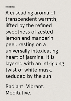 Embrace the illuminated and invigorating nectar of luminous bliss. A cascading aroma of transcendent warmth amplified with the refined sweetness of zested lemon and mandarin peel on a universally intoxicating heart of jasmine — rich and sweet, fruity with an addictive edge. Layered on an intriguing twist of mellow white musk seduced by the sun.