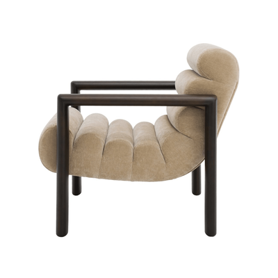 A sculptural statement with channeled velvet upholstery and cylindrical rubberwood arms, the Axel Accent Chair combines bold form with inviting comfort. Its deep, cushioned seat and architectural silhouette make it ideal as a standalone accent or paired within contemporary interiors.