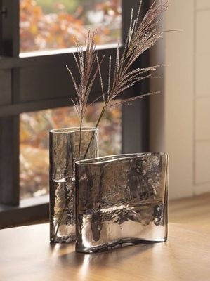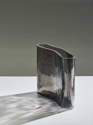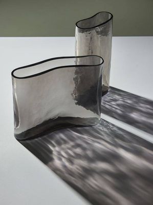 The vase is available in two interacting forms. Display this low, wide vase as a standalone piece or pair with the tall, narrow version (sold separately). Crafted from mottled grey glass with a tactile ripple effect, the design evokes the textures and tones of the coast while subtly blurring the contents within.