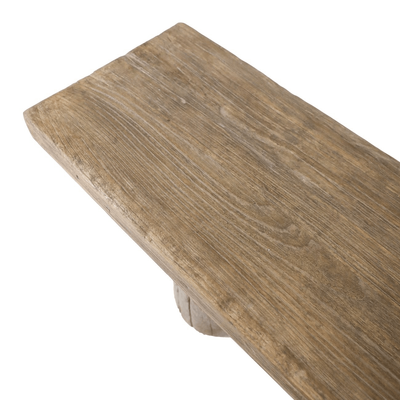 Reclaimed elm brings natural grain variation and visible knots, softened by a waxed finish that enhances texture and tone.