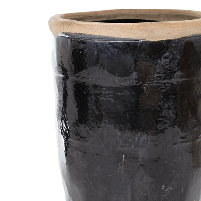 Finished in a deep black glaze, the surface carries natural variation and gentle irregularities that give depth and movement across the form. The softly rolled rim introduces a contrasting edge, highlighting the hand-finished nature of the piece and preventing the finish from reading flat or uniform.