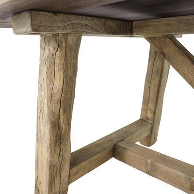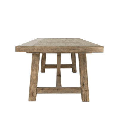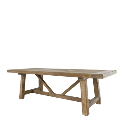 The Artisan Elm Dining Table draws on classic farmhouse trestle construction, with tapered legs and a cross-braced base that gives the piece strength and longevity. Its generous length and solid proportions create a strong horizontal presence without excess detail.