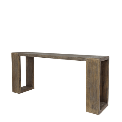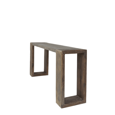 The Artisan Console Table is long and architectural, with framed rectangular legs that provide structure and an open profile. The construction introduces depth while keeping the overall form visually light.