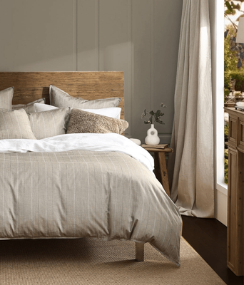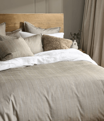 Bringing the outdoor in. A timeless stripe reimagined with a feather grey base and natural, lodge inspired accents. An elevated edition to the M.M linen lodge collection capturing the rustic charm of country design inspired by the natural environment perfect for your space. Digitally printed on 300 thread count pure cotton sateen with button closure, offered in a range of sizes from king single through to cali king, along with 2 matching pillowcovers.