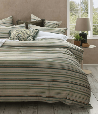Inspired by the rugged beauty and quiet heritage of Andora, Ordino features earthy tones of warm browns, deep greens, and muted blues, representing natural landscapes and timeworn European craftsmanship. The refined stripe pattern brings a sense of elegance, while the rich, grounded colour palette lends a rustic warmth that feels both authentic and enduring. Digitally printed on 250 thread count pure cotton percale. Thoughtfully designed, sustainably produced by our scope 3 carbon neutral company.