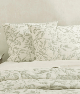 The Verdun bedspread featuring M.M Linen classic cape stripe reverse and set on a soft creamy base. The art of simple. Intricate and illustrated bringing timeless charm, inspired by the French countryside and beautiful gardens. Thoughtfully designed, sustainably produced by our Scope 3 Carbon Neutral company from 100% European flax Linen cotton blend.