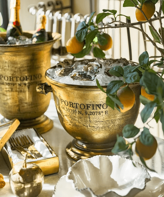 Style Description: Entertain in style with the Portofino Champagne Bucket. Featuring a stunning antique gold finish, it adds a touch of elegance to any gathering, from cosy dinners to festive celebrations. This wine bucket not only keeps your beverages perfectly chilled but also serves as a beautiful centrepiece for your bar or dining setup.