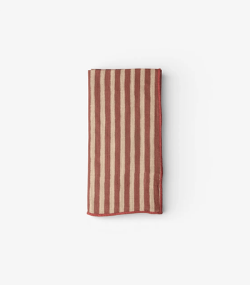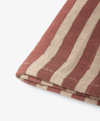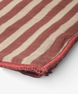 Hand block printed cotton gauze napkin in a classic red and natural stripe, finished with contrast overlocked edges. Lightly textured and relaxed in feel, it will add an easy, rustic charm to everyday and festive table settings.