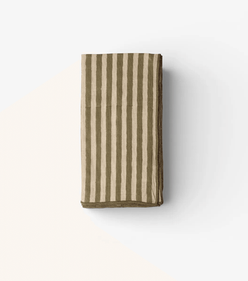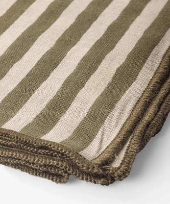 Hand block printed cotton gauze napkin in a classic green and natural stripe, finished with contrast overlocked edges. Lightly textured and relaxed in feel, it will add an easy, rustic charm to everyday and festive table settings.