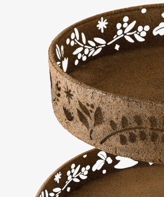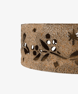 This tiered Yuletide stand in a rust finish can be used for wrapped sweets, gifts and favours for the festive season. Decorated with a festive cut out pattern.