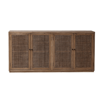 CRAFTED FROM SOLID ELM, THE NAIA ELM SIDEBOARD WITH 4 RATTAN DOORS SHOWCASES A BEAUTIFUL BALANCE OF NATURAL TEXTURE AND TIMELESS DESIGN. THE WARM ELM FRAME HIGHLIGHTS DISTINCTIVE GRAIN DETAILS, WHILE THE HANDWOVEN RATTAN DOORS ADD LIGHTNESS AND COASTAL CHARACTER. WITH A CLEAN, STRUCTURED SILHOUETTE AND GENEROUS STORAGE BEHIND FOUR DOORS, THIS SIDEBOARD IS BOTH PRACTICAL AND ELEGANT. PERFECT FOR DINING OR LIVING SPACES, IT BRINGS A RELAXED, ORGANIC FEEL WITH REFINED APPEAL TO ANY INTERIOR.