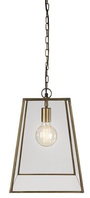 The Artwood Slim City Pendant in Antique Brass is a sleek ceiling lamp crafted from tempered glass with a sturdy metal A-frame in a geometric design.