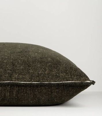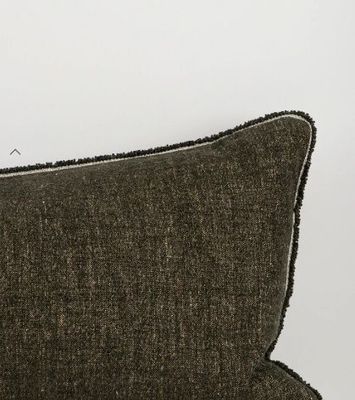 Crafted from a matte cotton-linen chenille, the Sutton cushion features an upholstery-grade velvety pile with a soft, tactile surface. The elongated lodge-style shape is framed by a tightly woven border and delicate fringe. Deep olive tones and textured yarns create a vintage-worn finish that brings an earthy, layered warmth to interiors.
