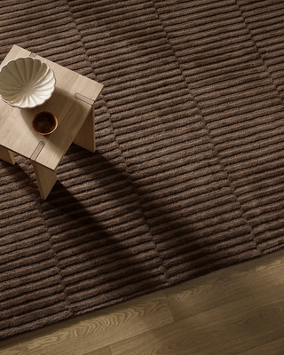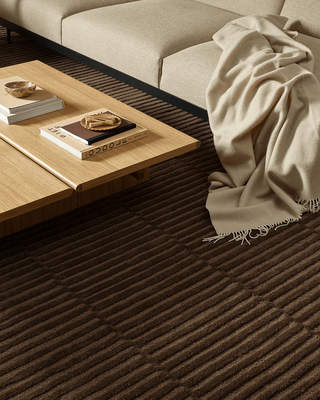 A visual and textural masterpiece, the Anni combines statement design with casual simplicity. Handcrafted from 100% NZ wool, the offset linear pattern is achieved through sections of cut and looped pile, resulting in a captivating textural aesthetic. The rich chocolate tone adds a luxurious depth, and grounds a space with warmth and sophistication.