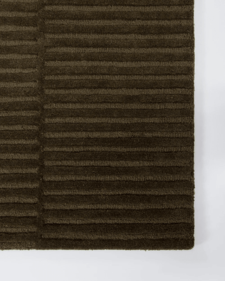 A visual and textural masterpiece, the Anni combines statement design with casual simplicity. Handcrafted from 100% NZ wool, the offset linear pattern is achieved through sections of cut and looped pile, resulting in a captivating textural aesthetic. The earthy mangrove tone adds a natural, grounded quality, that pairs beautifully with neutrals and warm woods.
