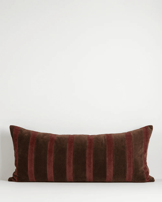 Bringing together soft cotton velvet and tactile corduroy, the Huxley lodge features a striped patchwork in cherry tones on a rich chocolate base. A sensory-rich composition, the interplay of textures, striking design, and elongated shape creates a cozy statement layer for both living and bedroom spaces.