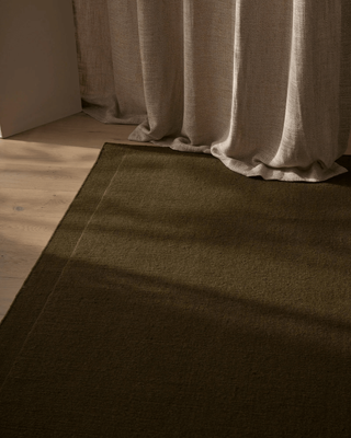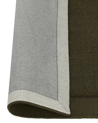 Cassio Jasper is a deep olive shade, finished with a hand-stitched inspired serged edge in the same tone.