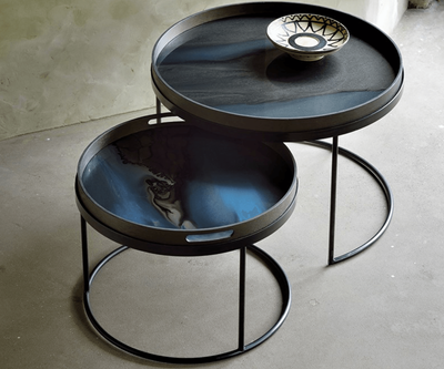 Large Ethnicraft trays pair seamlessly with nesting table sets (ordered separately).