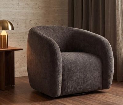 The Maxwell Swivel Chair strikes the perfect balance of sculpted curves, deep comfort, and timeless style. A higher back, tapered arms, and a generous seat create an inviting, enveloping form – beautifully finished in James Dunlop fabric, Snugly in Pinecone, a rich, warm chocolate tone with depth and natural warmth.