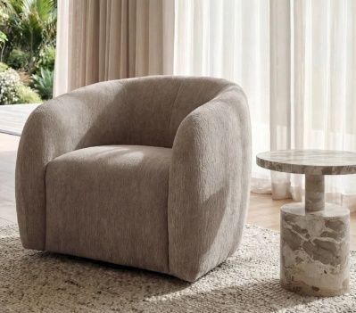 The Maxwell Swivel Chair strikes the perfect balance of sculpted curves, deep comfort, and timeless style. A higher back, tapered arms, and a generous seat create an inviting, enveloping form – beautifully finished in James Dunlop fabric, Snugly in Chinchilla, a warm, refined neutral with soft depth and understated elegance.