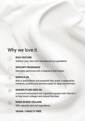 Infused with vitamin rich Kakadu Plum oil and Marula Oil. An all-rounder, marula oil is both anti-inflammatory and rich in potent antioxidants; vitamin C, vitamin E, essential amino acids and flavonoids. These antioxidants with omegas 6 and 9, replenish moisture and minimises the appearance of redness. The high essential fatty acid composition also mimics that of the outer layer of the skin, allowing for optimum absorption.